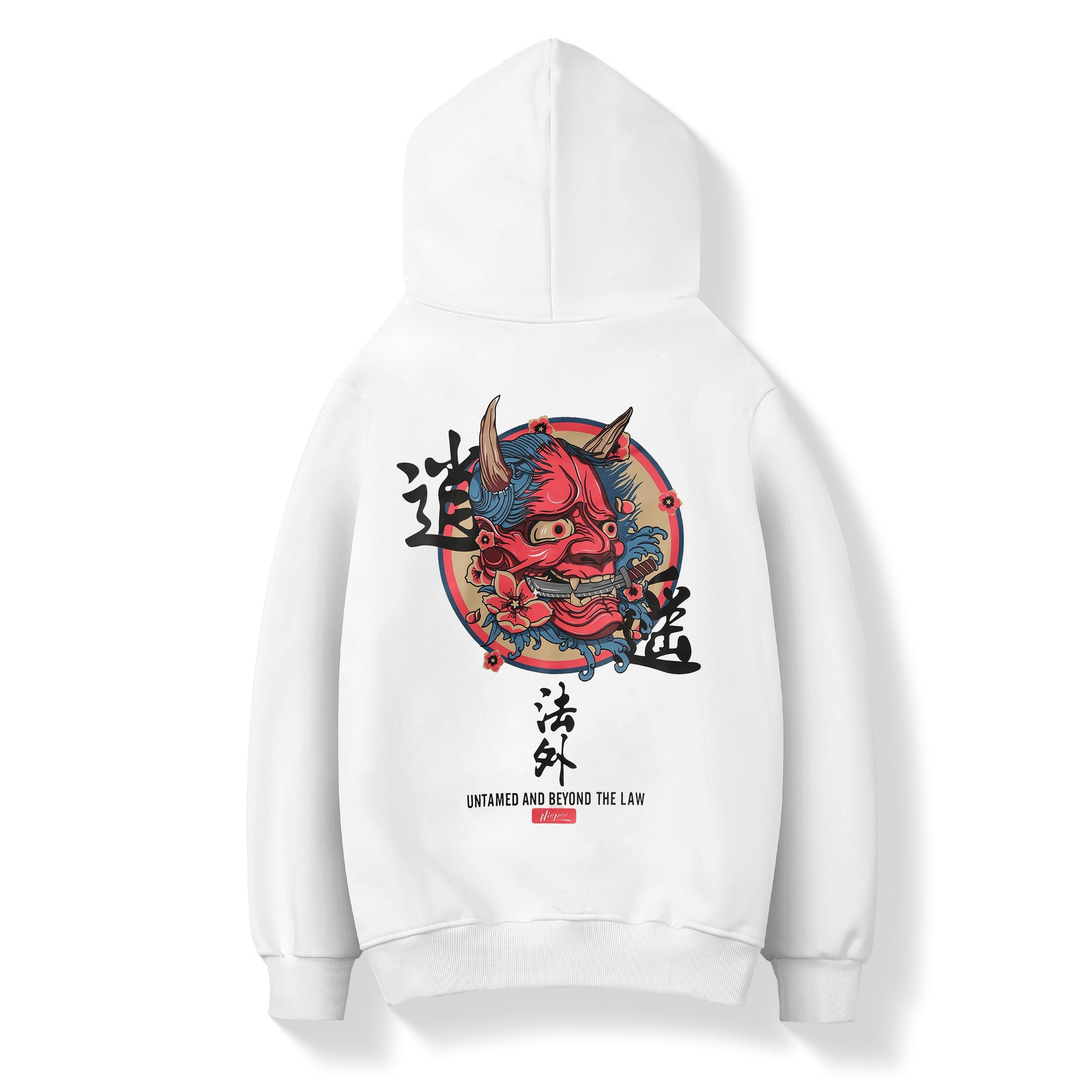 - La sudadera presenta una pintura japonesa de un demonio mordiéndose un cuchillo en la boca. "Indomable y más allá de la ley" está escrito en kanji japonés en la parte delantera y trasera.