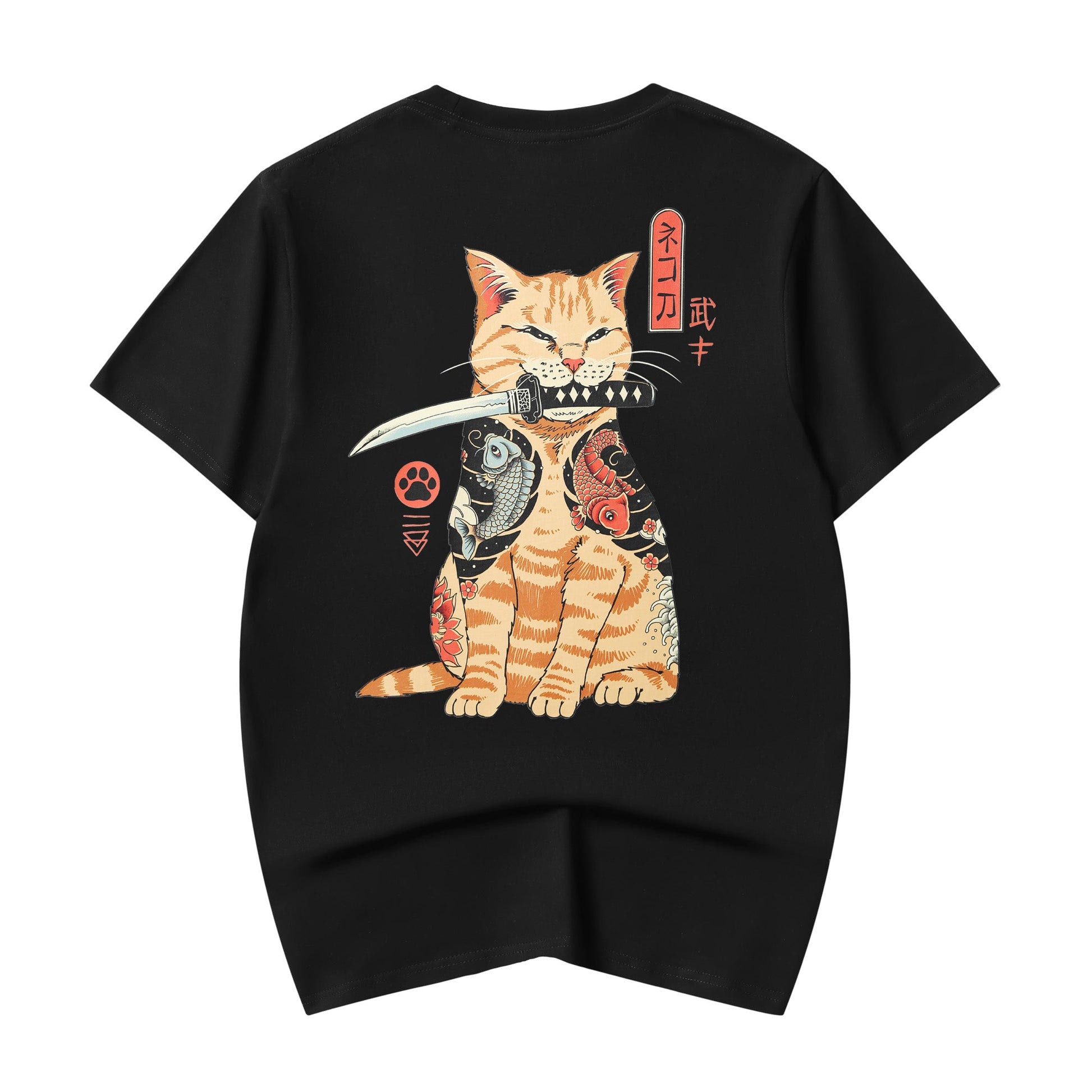 - La camiseta de manga corta presenta un gato samurái japonés que sostiene un cuchillo en la boca con tatuajes en cada brazo.