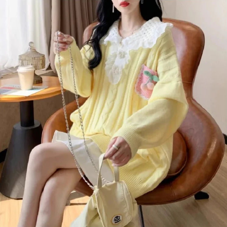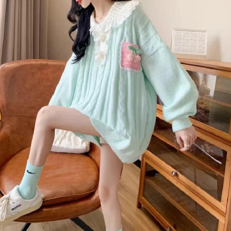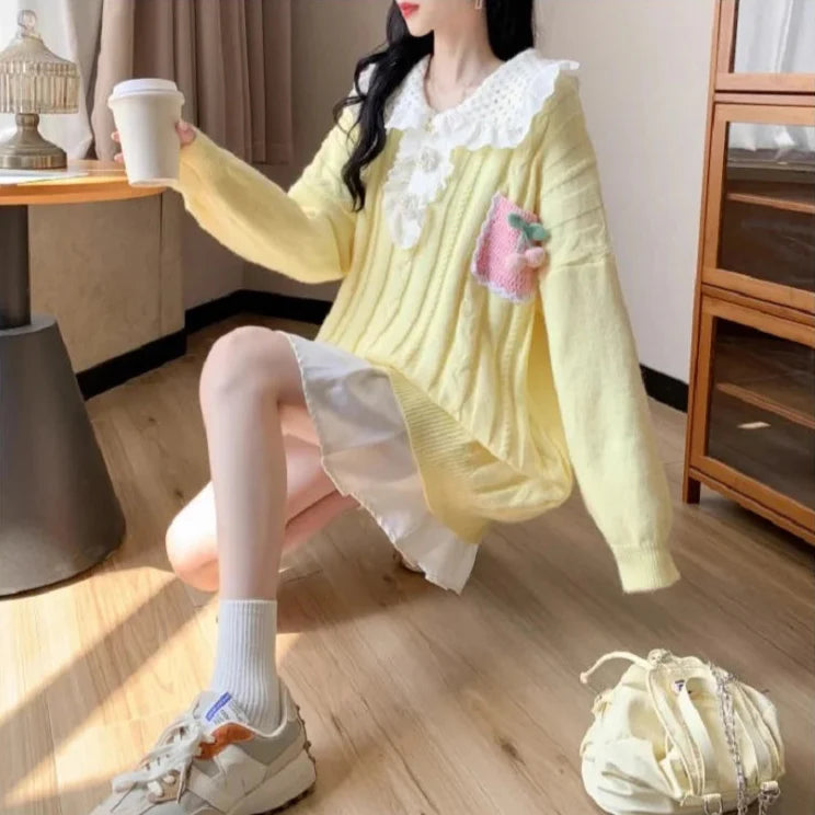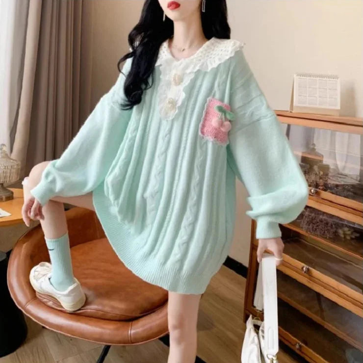 Préparez-vous à vous blottir dans ce pull en tricot à poche cerise, disponible dans une variété de couleurs. Avec sa jolie cerise sur la poche avant, ce modèle kawaii est parfait pour ajouter une touche de fantaisie à votre garde-robe. (La saison des pulls est devenue encore plus mignonne !)
