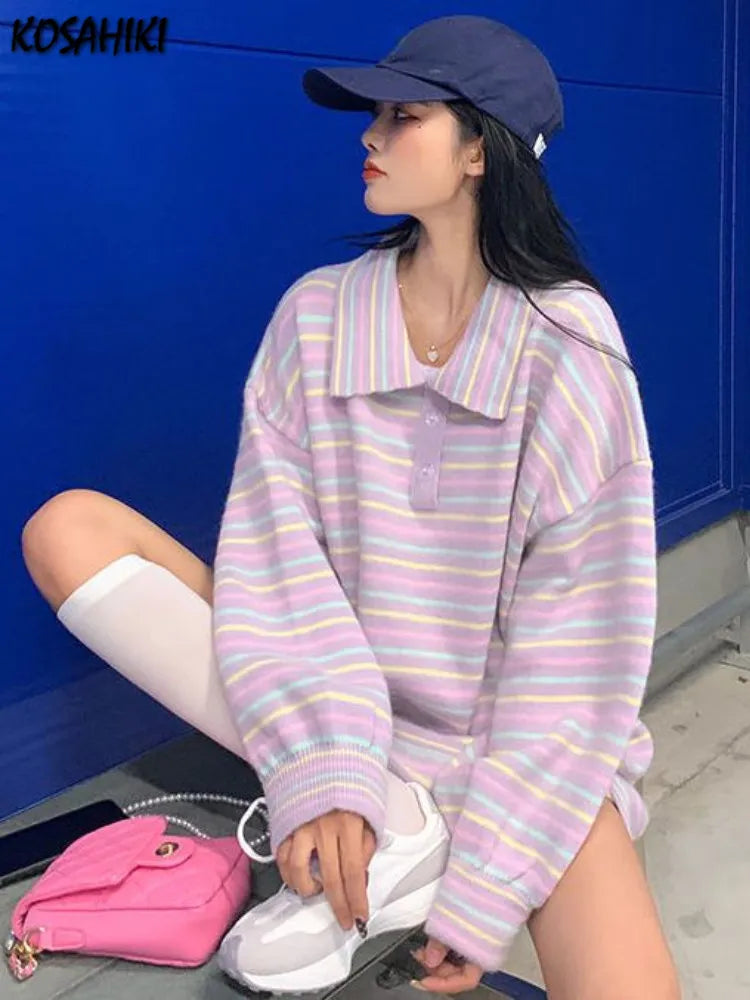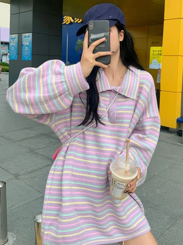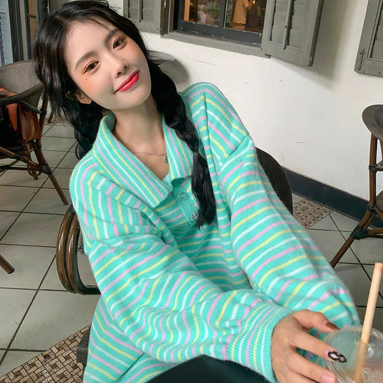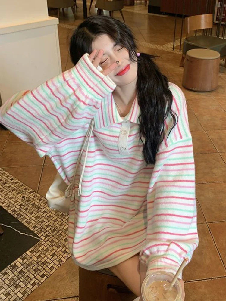 Égayez votre garde-robe avec notre pull à rayures arc-en-ciel à col, une pièce en maille vibrante et joyeuse qui apportera une touche de couleur à vos tenues d'hiver ! Ce pull kawaii arbore un motif ludique à rayures arc-en-ciel, parfait pour apporter joie et positivité à votre look d'hiver. Son col ajoute une touche de sophistication, tandis que sa coupe décontractée assure confort et polyvalence.