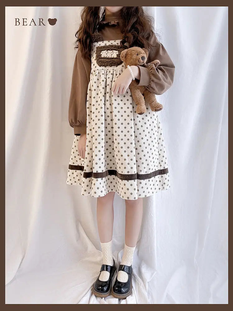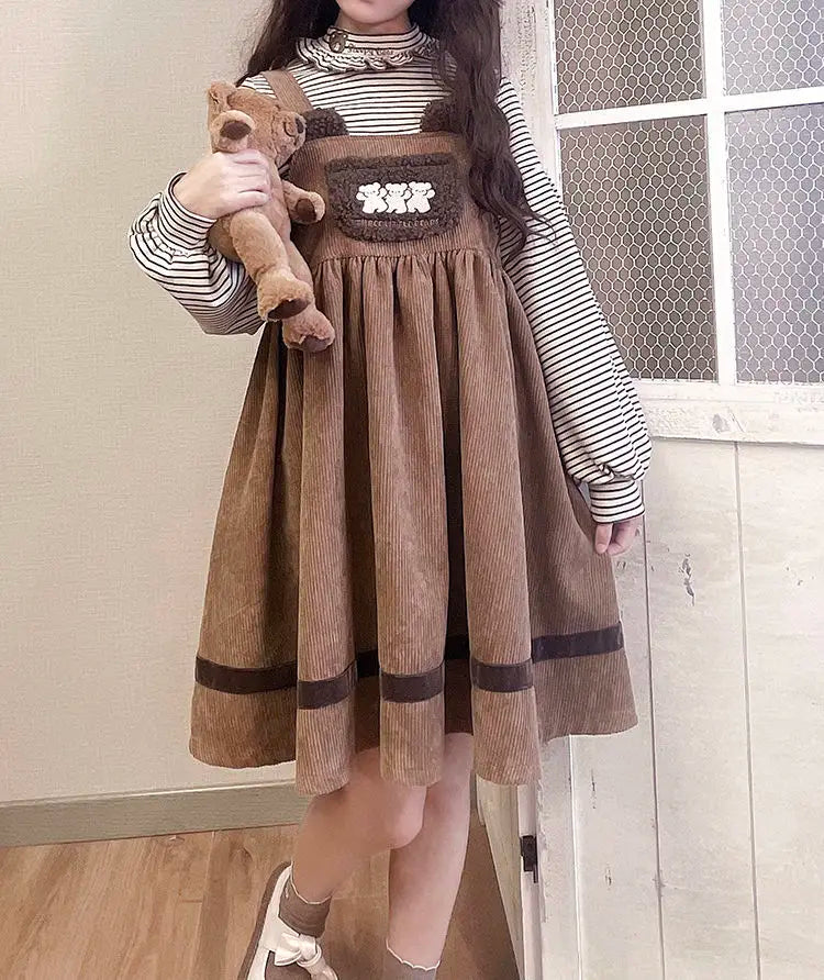 Rehaussez votre style kawaii avec notre robe salopette en velours côtelé motif ours en peluche ! Cette robe enchanteresse allie la chaleur du velours côtelé marron au charme ludique des ours en peluche, ce qui en fait un incontournable de votre garde-robe.