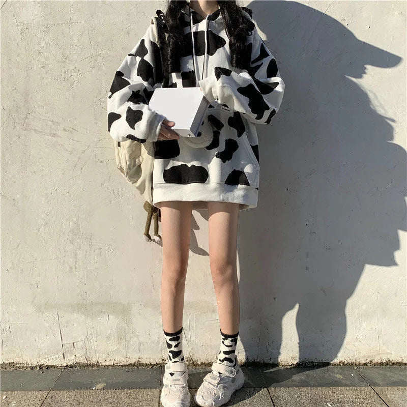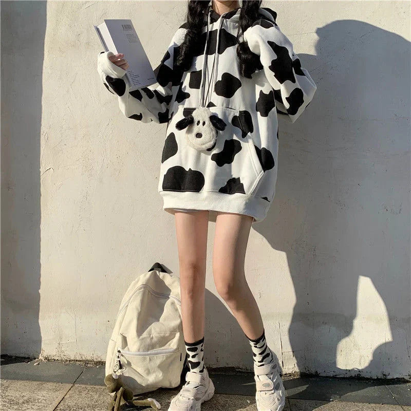 Révélez la tendance qui sommeille en vous avec notre sweat à capuche imprimé vache : un incontournable élégant et ludique alliant design avant-gardiste et confort douillet ! Ce sweat à capuche kawaii arbore un imprimé vache chic, combinant des teintes classiques noires et blanches pour un look audacieux et accrocheur. Son tissu doux et confortable assure un ajustement parfait et une chaleur optimale, idéal pour les sorties décontractées, les journées fraîches ou pour ajouter une touche de charme décalé à votre style streetwear.