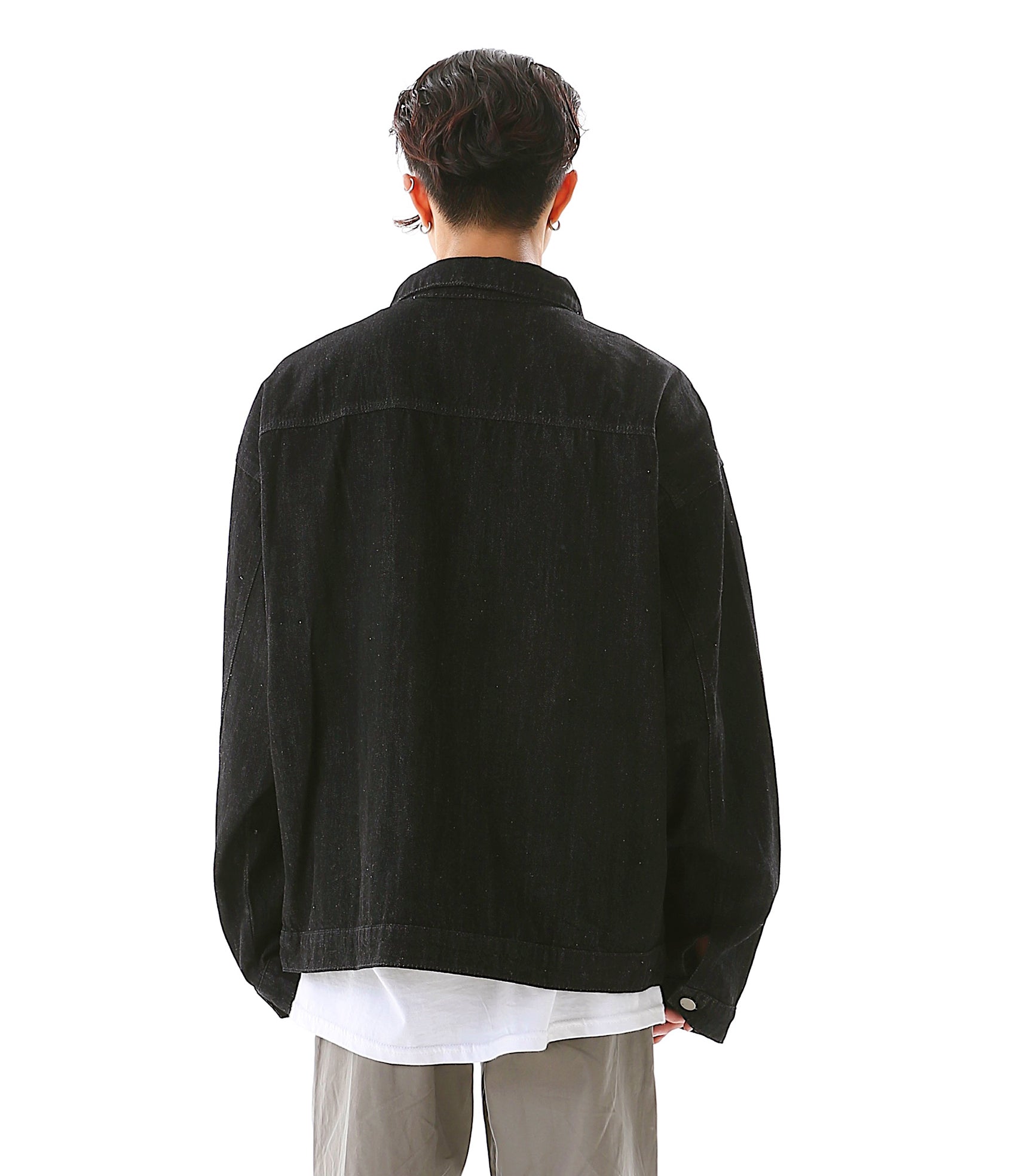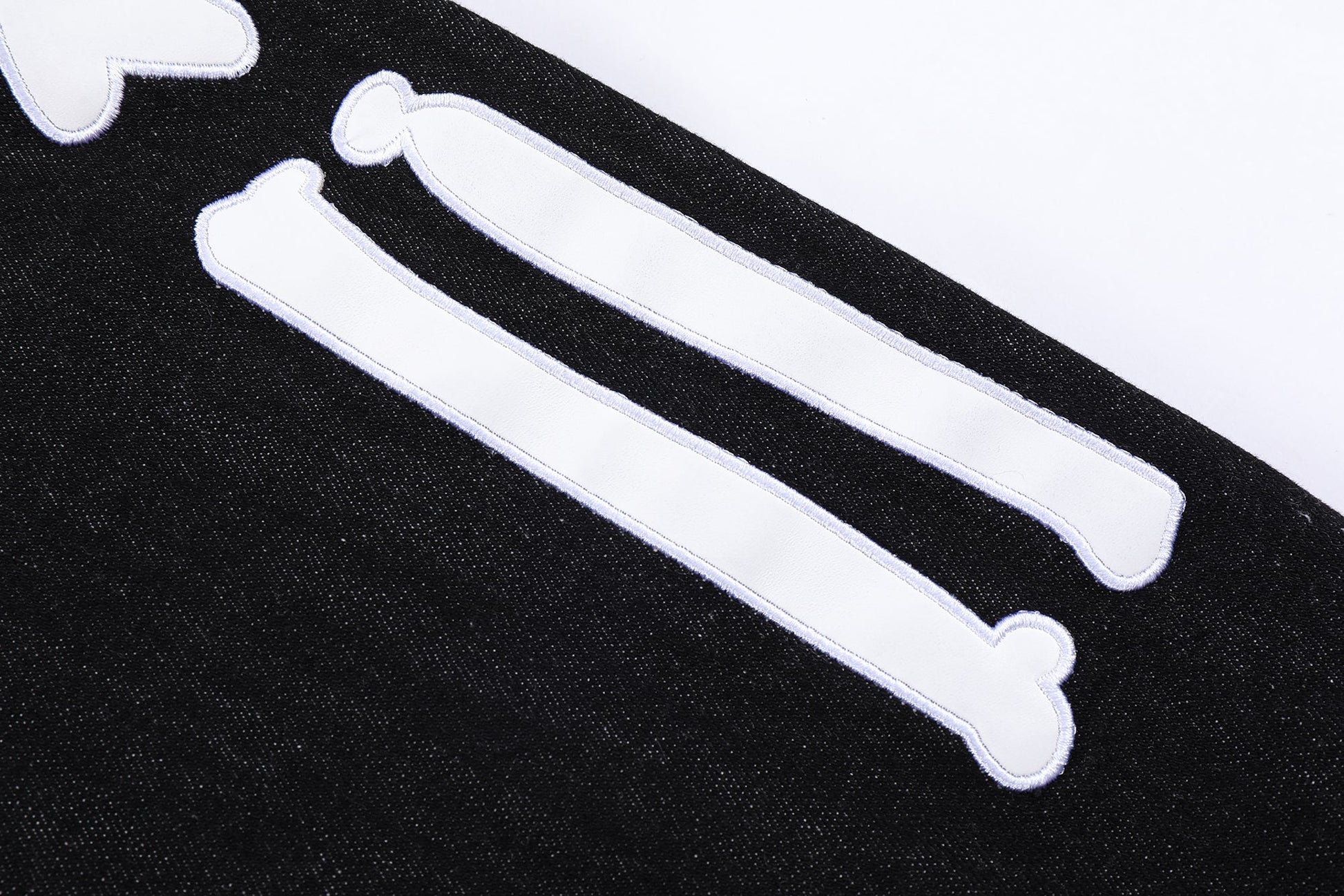 - Veste en jean noir avec motif de peinture cousu sur le devant et les manches