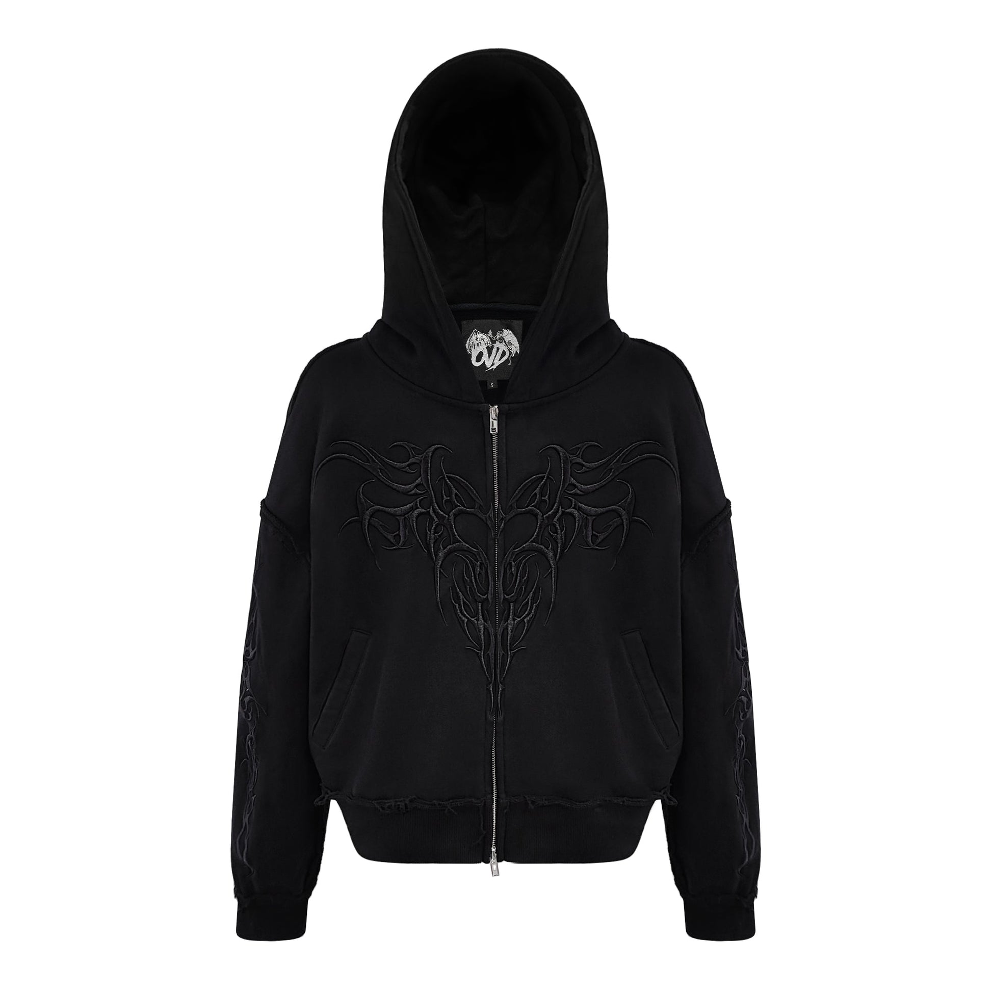 The centerpiece of the DRKSAINT lineup. This hoodie is defined by its substantial weight and intricate, 3D-sculpted detailing. Crafted from heavyweight, softened French Terry, it features high-density Tribalheart embroidery that wraps across the chest, sleeves, and hood, creating a tactile "armor" effect.