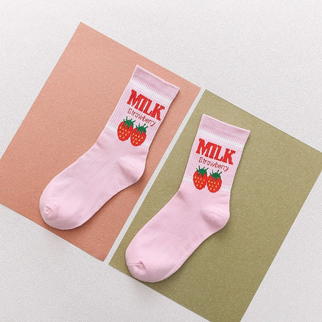 Ces chaussettes kawaii Fruits et Lait complètent parfaitement toutes vos tenues ! Confectionnées dans un mélange de coton doux et confortable, elles arborent un adorable motif de tranches de fruits et de briques de lait. Chaque chaussette a un motif différent, ce qui en fait un accessoire amusant et unique.