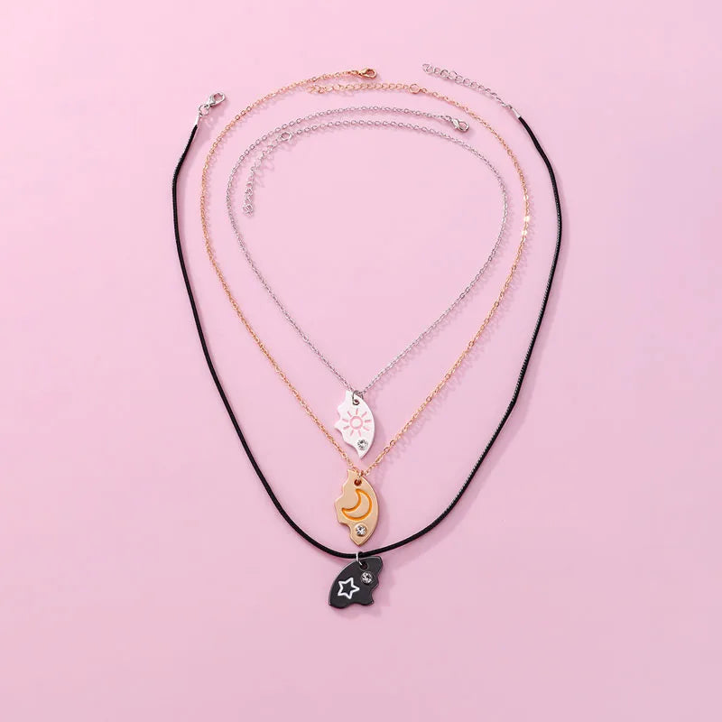 Offrez un cadeau d'amitié céleste avec nos colliers d'amitié Lune, Soleil et Étoile ! Chaque collier arbore un motif unique symbolisant l'amitié et l'unité. Parfaits pour témoigner votre amour à votre meilleure amie, ces colliers sont extraordinaires !