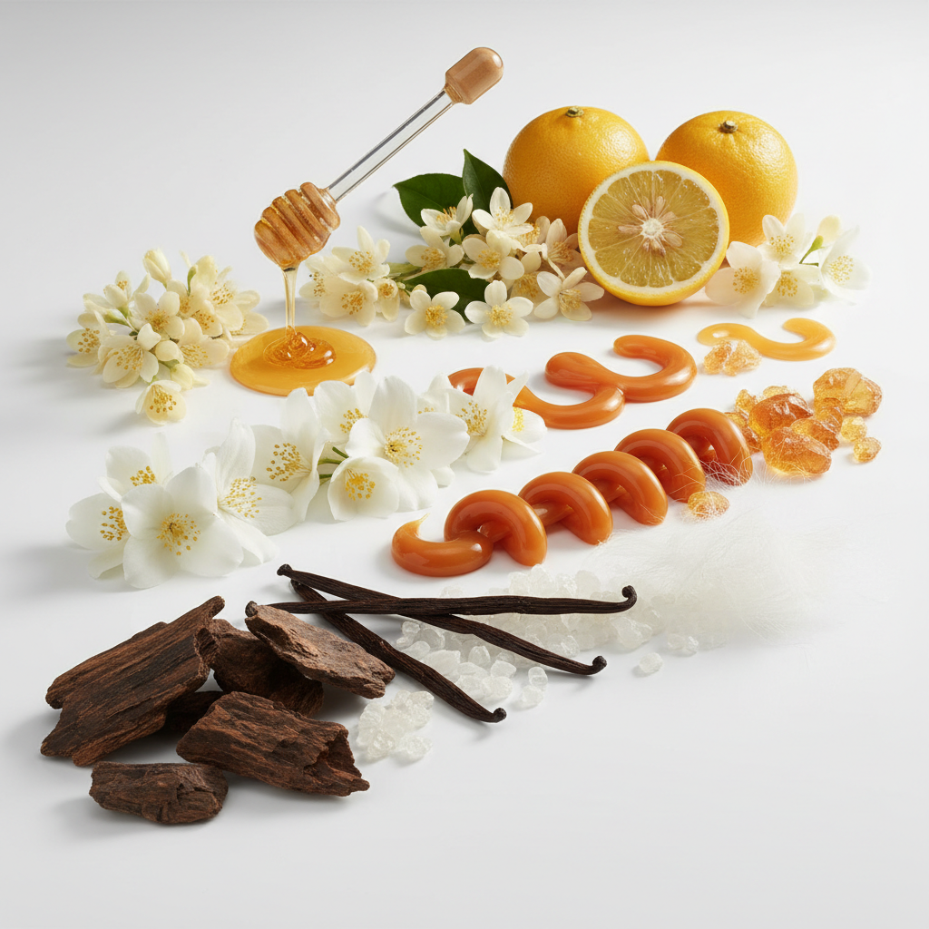 Top: Italian Bergamot, Honey, Osmanthus | Heart: Jasmine Grandiflorum, Caramel, Amber | Base: Laotian Oud, Madagascan Vanilla, Benzoin, Musk