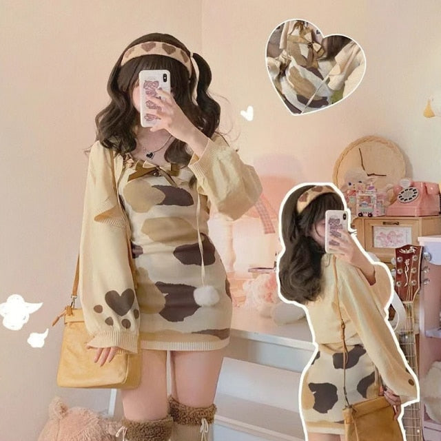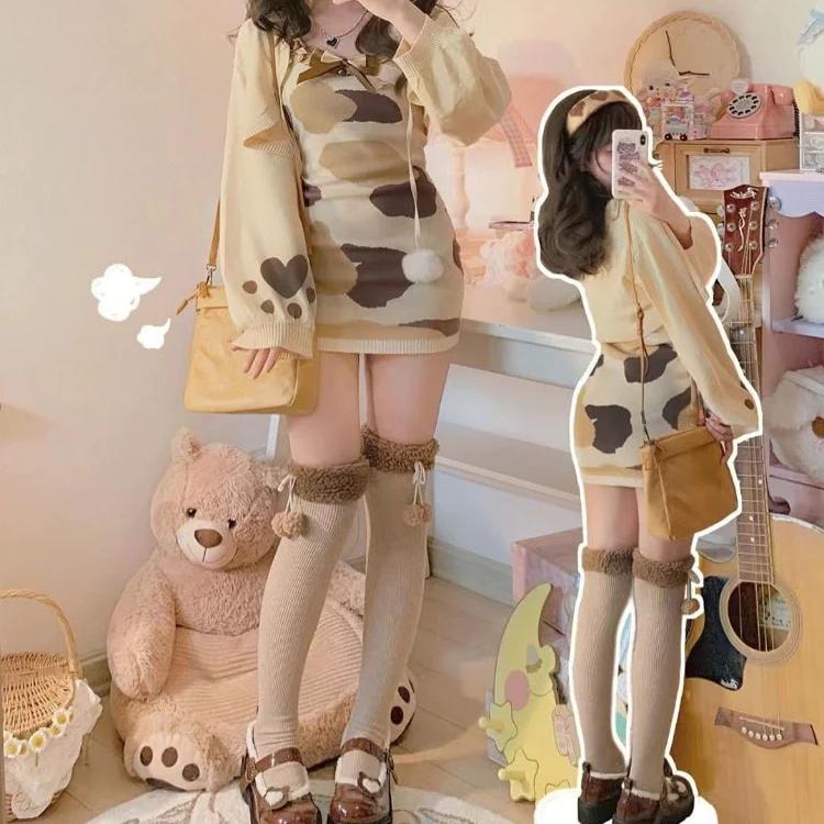 Robe camouflage : La pièce maîtresse de cette tenue kawaii est une robe à imprimé camouflage marron et beige. Ce n'est pas un camouflage classique : elle est ornée d'adorables empreintes de pattes d'animaux, ajoutant une touche ludique et kawaii au motif classique.