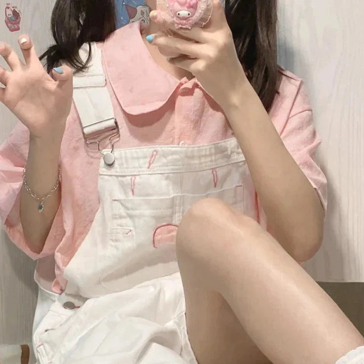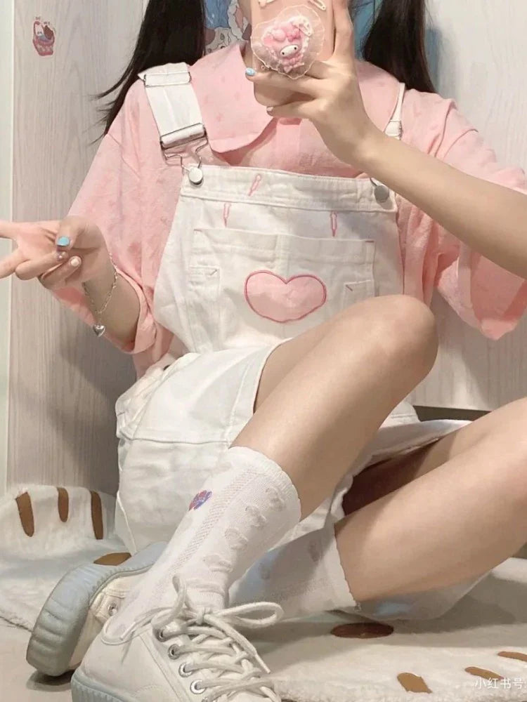 Préparez-vous à adopter cette tenue kawaii et adorable, composée d'une chemise rose et d'une salopette blanche ! Composée d'une chemise rose à col et d'une salopette blanche courte ornée d'un cœur rose, cette tenue kawaii fera tourner les têtes et vous démarquera. Parfaite pour celles qui aiment la touche de fun.