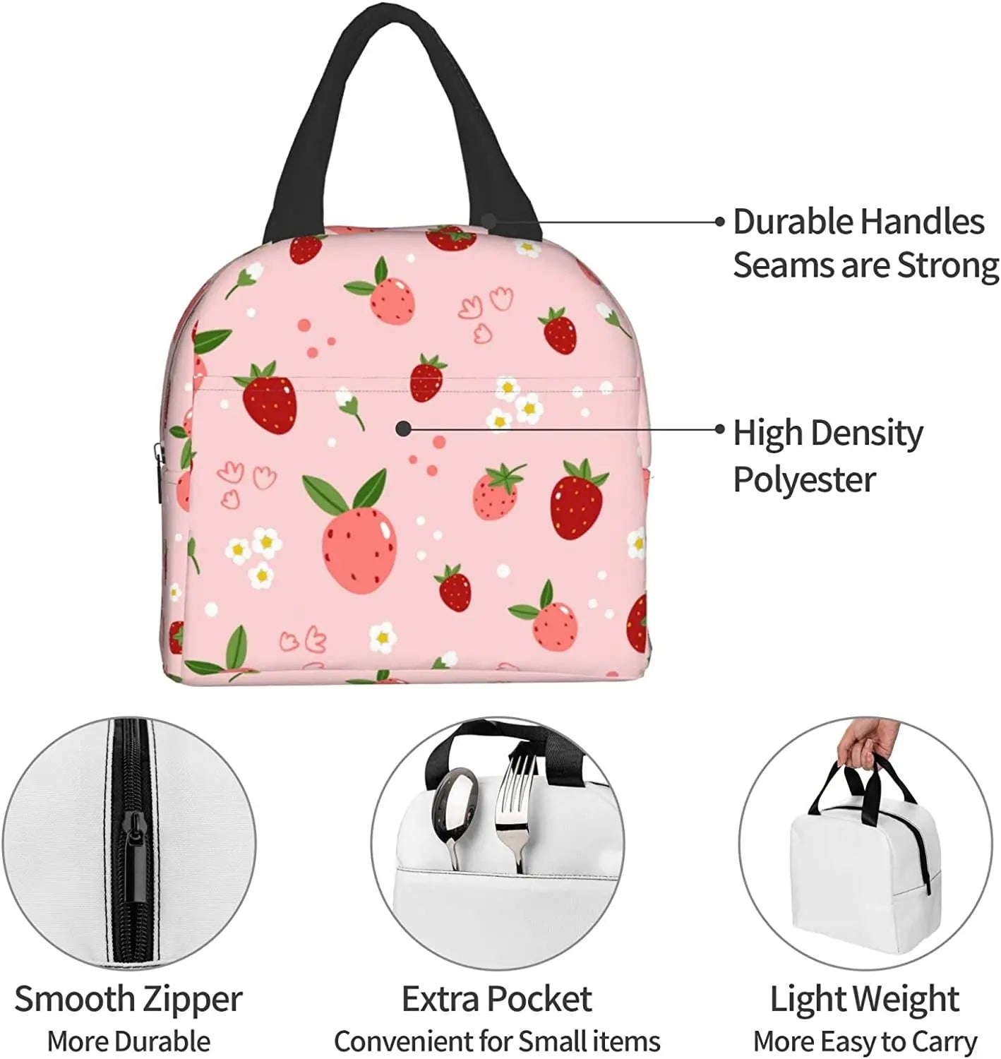 Transformez votre déjeuner avec le charme délicieux de nos sacs à lunch isothermes à imprimé fraise – où la fraîcheur rencontre la fantaisie fruitée.