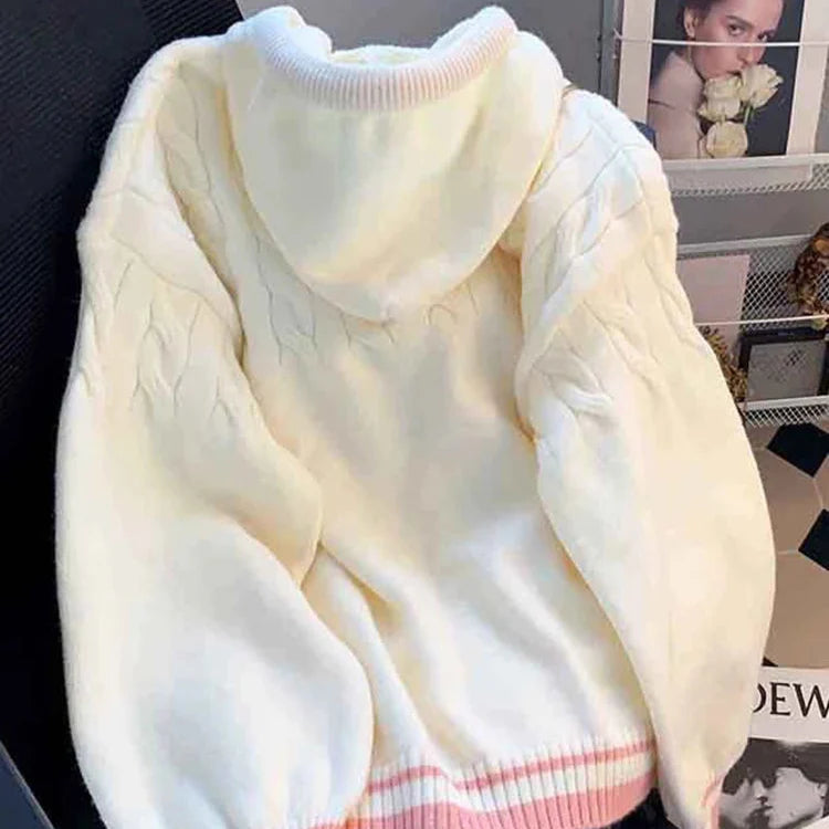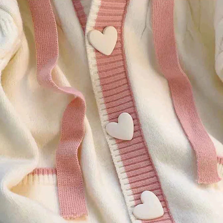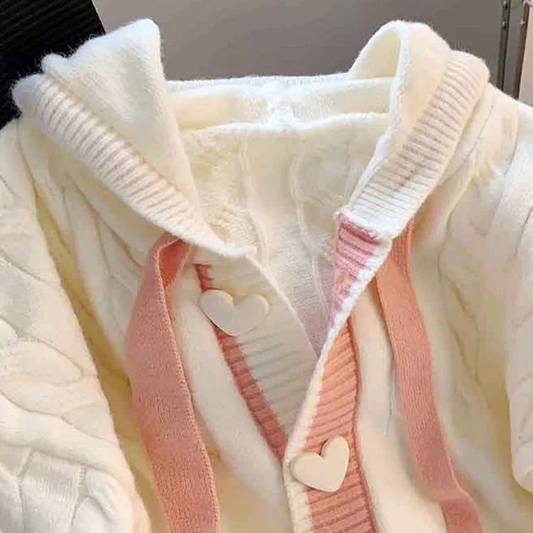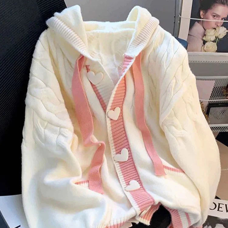 Restez au chaud et mignon avec notre cardigan à capuche Sweet Hearts. Ce modèle kawaii se compose d'un cardigan blanc avec une bordure rose et des boutons en forme de cœur pour une touche de douceur. Idéal pour les journées fraîches et pour ajouter une touche de couleur à votre tenue. (Surtout mignon !)