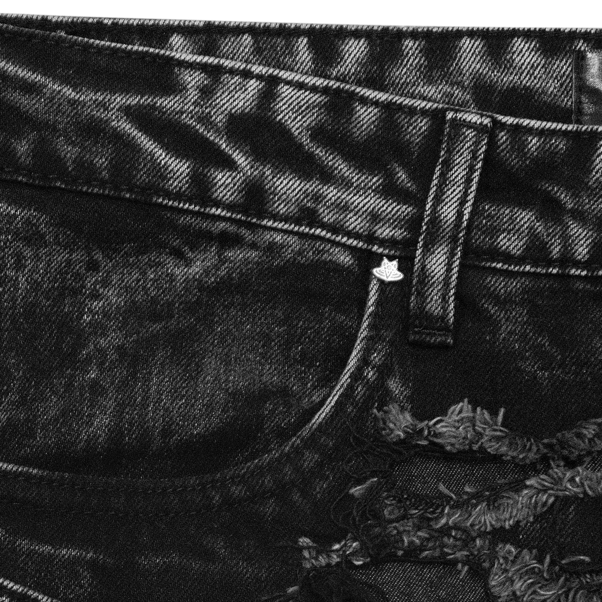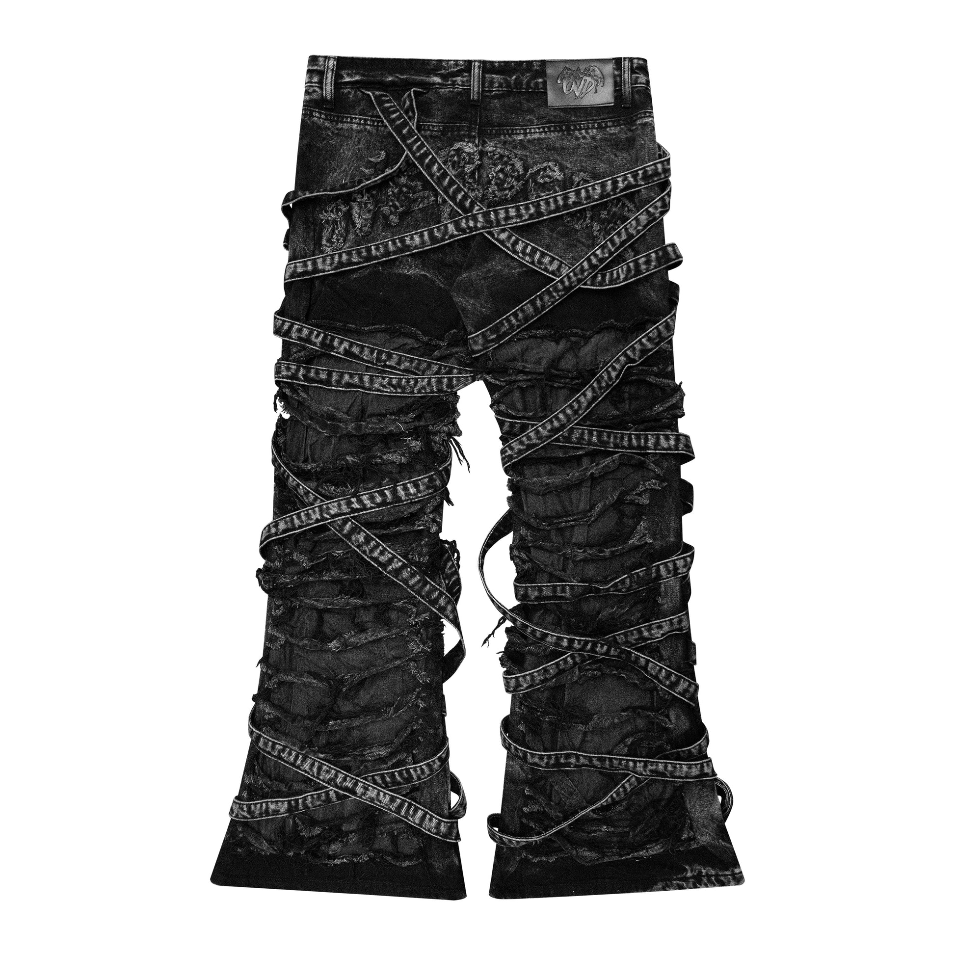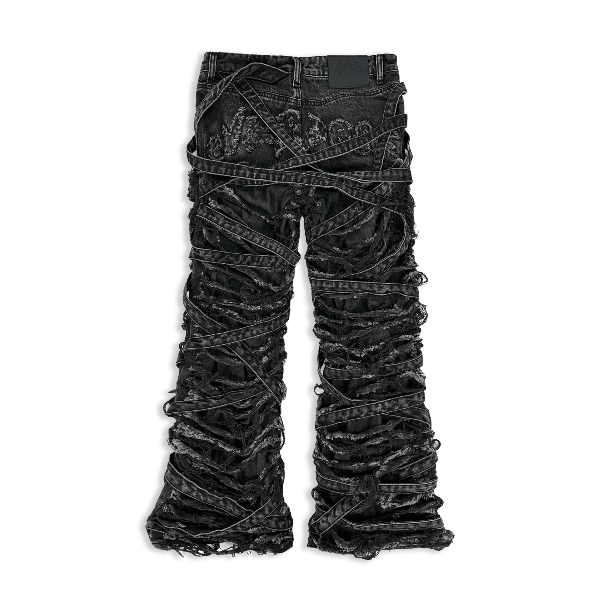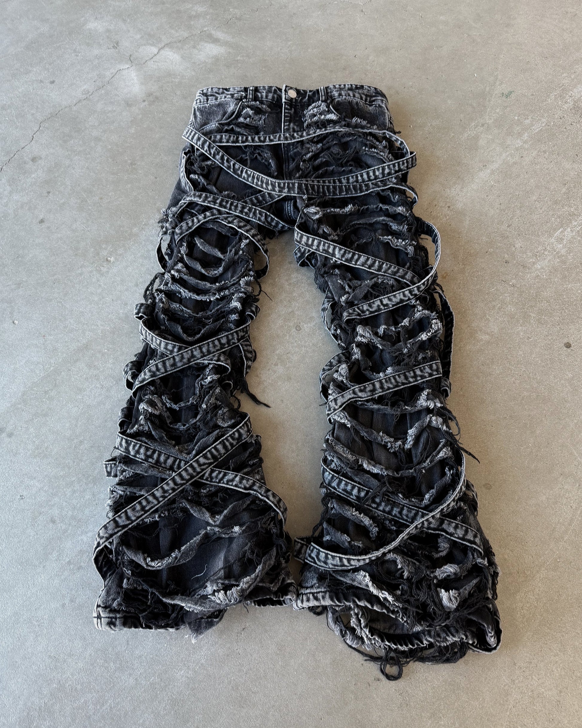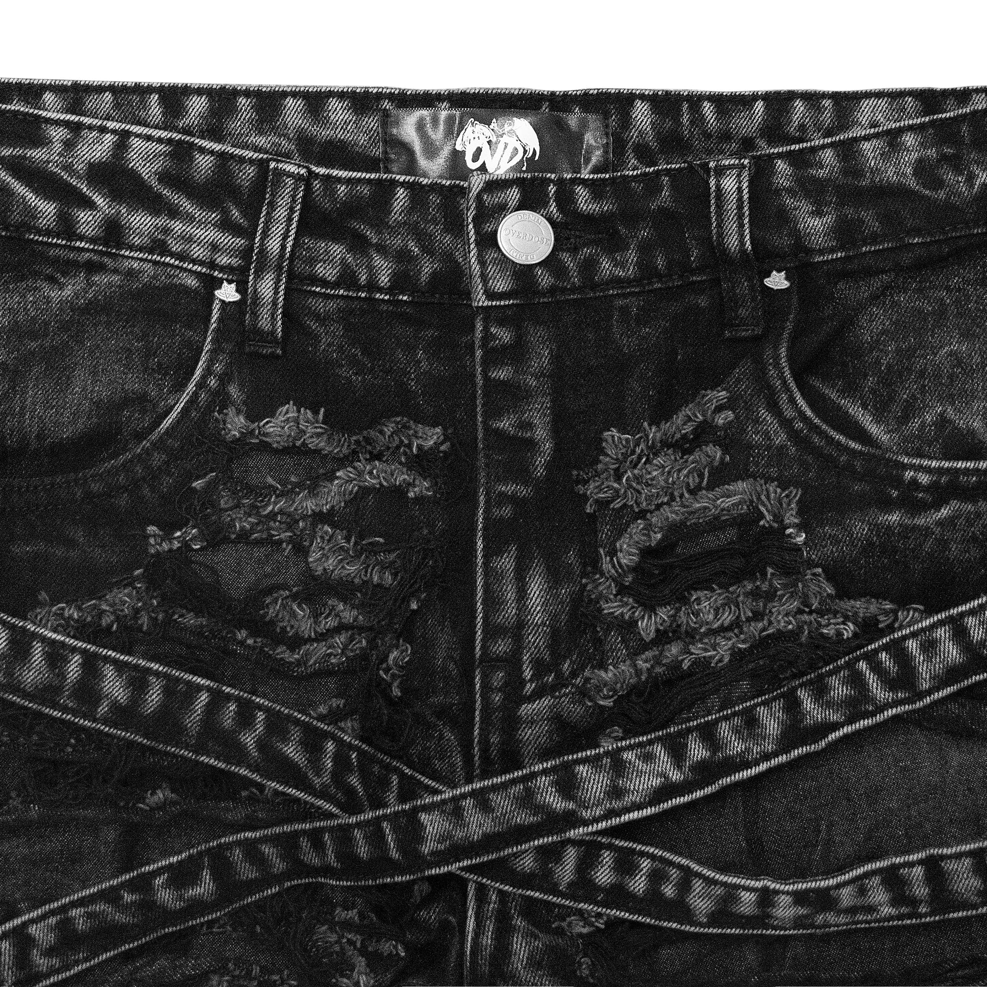 stonewash onyx. double layered heavy cotton washed denim. distressed & destroyed. overdose denim sewn on patches. external straps flooded throughout. leather OVD tag. custom silver hardware. pre-made and extremely limited. true to size.