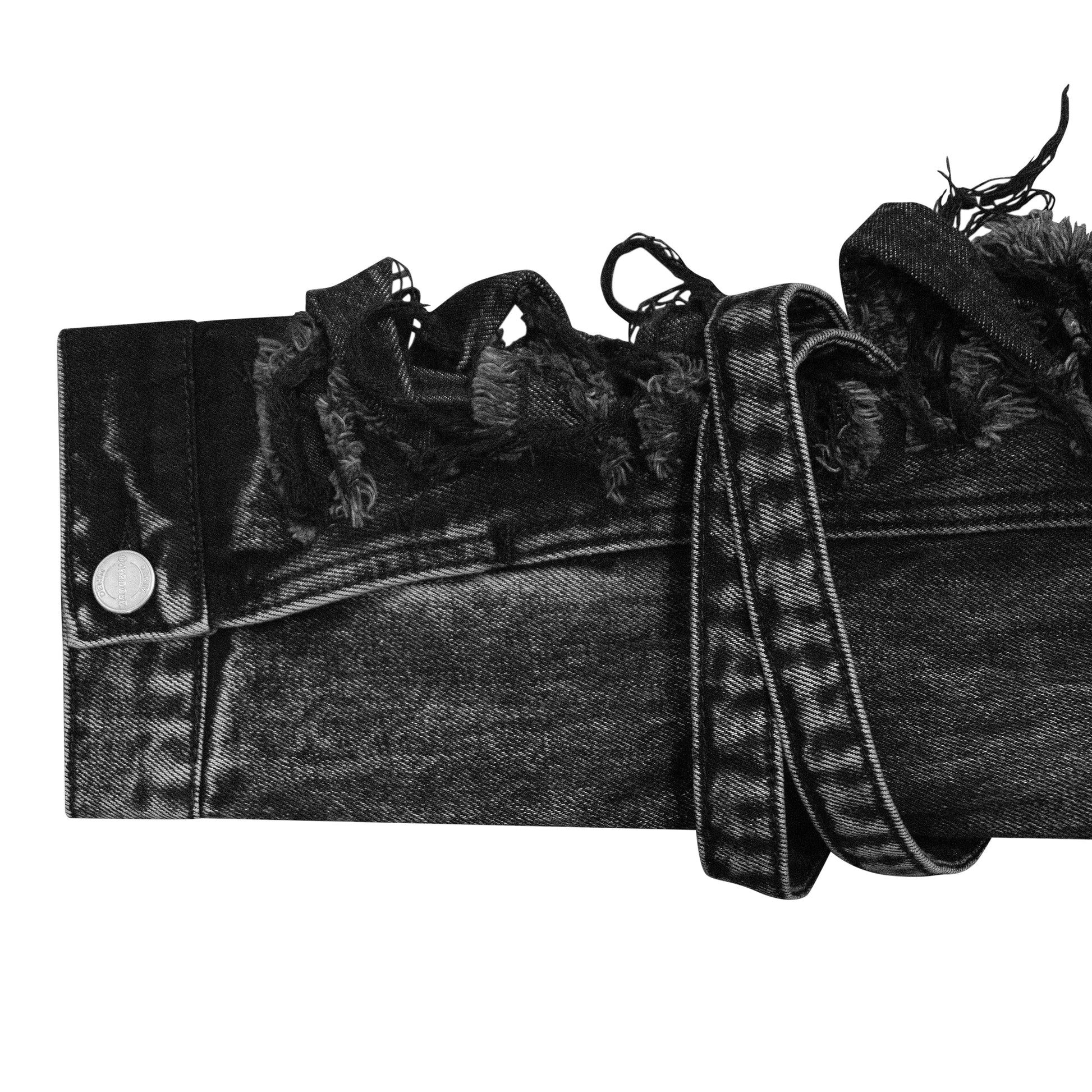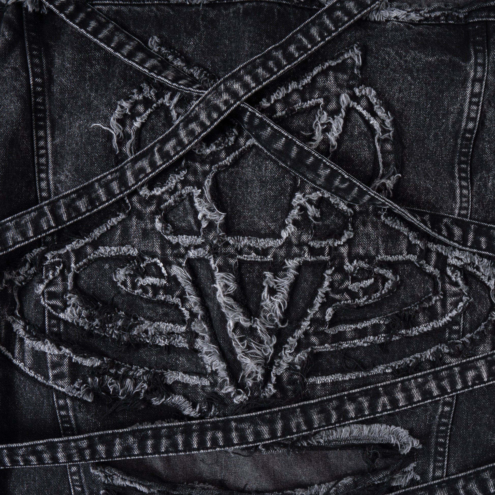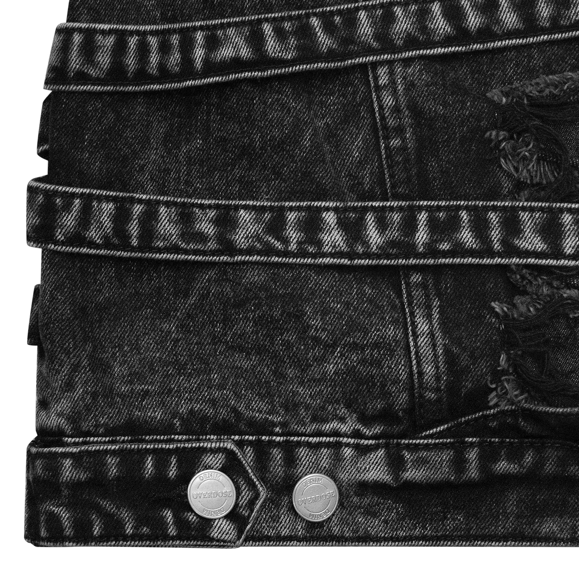 heavyweight washed and distressed double-layered denim jacket with denim straps flooded throughout. "overdose" written in denim patches on the front along with custom ovd metal buttons. the back features a giant denim "s999turn" logo patch. fits true to size, we recommend to size up for a baggier fit.