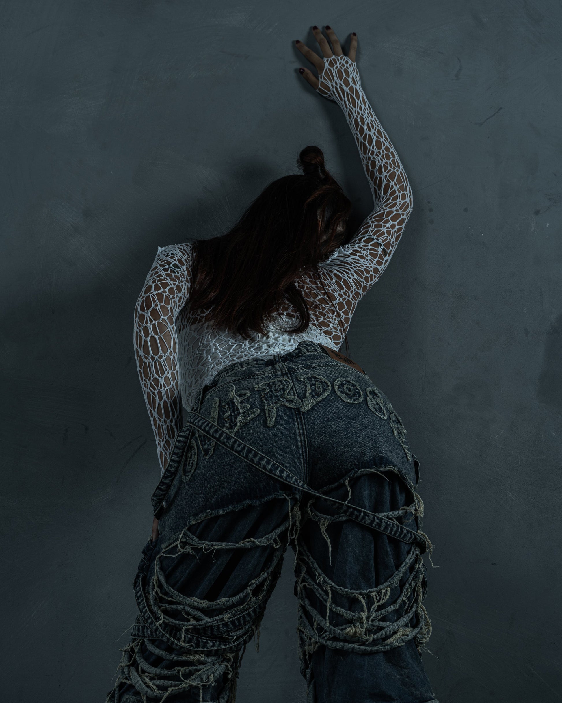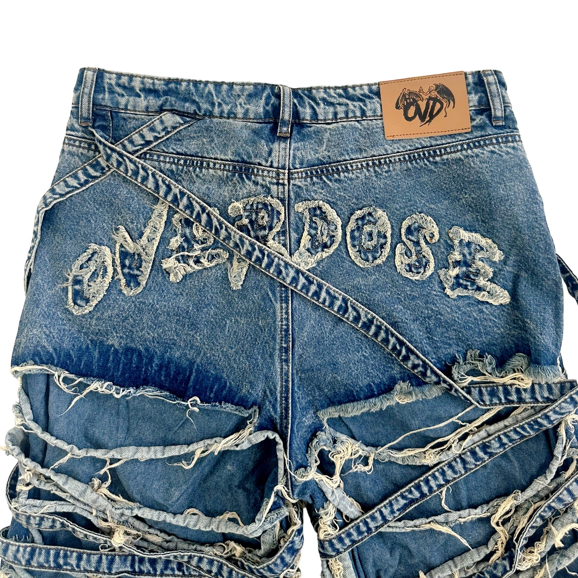 light washed double layered heavy cotton washed denim. distressed & destroyed. overdose denim sewn on patches. bondage straps flooded throughout. leather OVD tag. custom silver hardware. fits true to size. due to high demand, please allow up to 2 weeks for shipping.