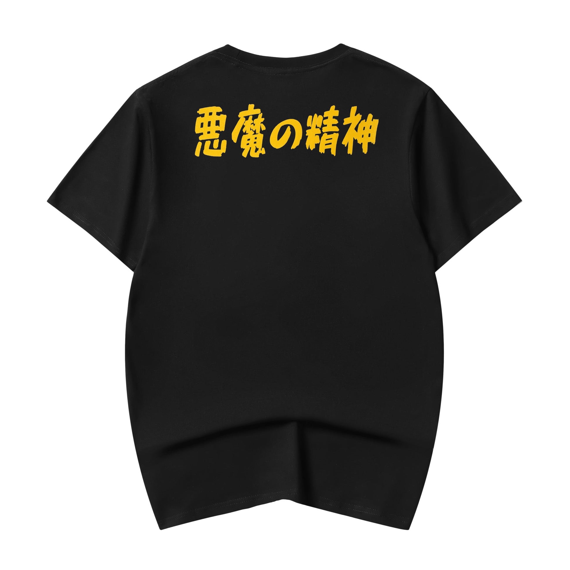- Le t-shirt à manches courtes présente un kanji japonais se traduisant par « Énergie démoniaque » et un graphique d'un visage révélant le démon caché dans un visage humain signalant la méchanceté de nombreux humains.