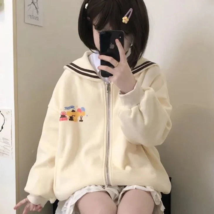 Embarquez avec style grâce à notre pull col marin zippé, un vêtement d'inspiration nautique alliant élégance classique et confort moderne pour un look chic et douillet ! Ce pull kawaii arbore un élégant col marin zippé sur le devant, rappelant la mode maritime intemporelle.