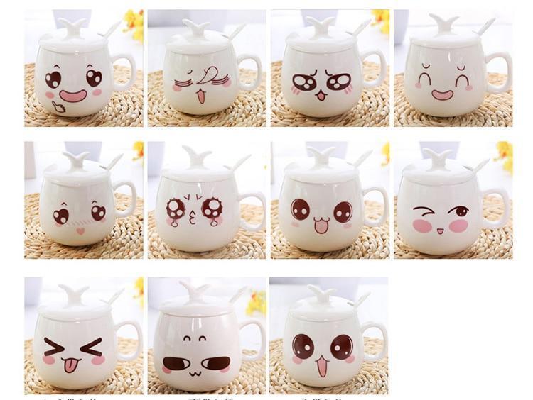Indulge in your love for kawaii with this cute ceramic mug with a lid and spoon, featuring an adorable face design. Available in 11 different face styles, this mug is the perfect addition to your morning routine. Whether you're sipping on coffee or tea, the lid helps to keep your drink warm while also preventing spills.