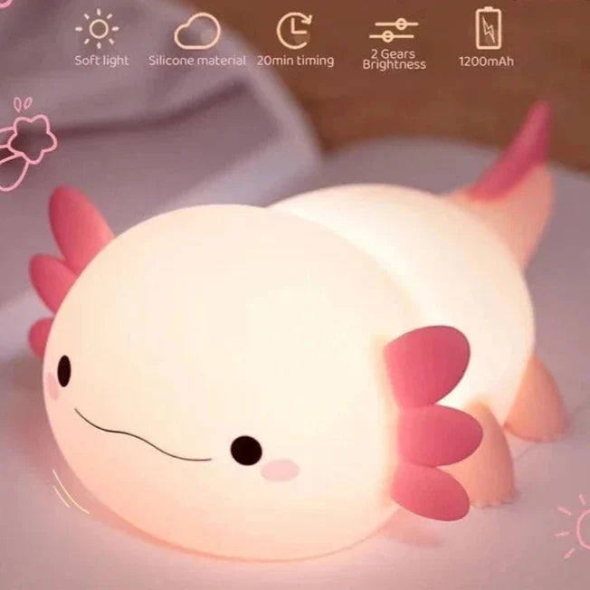 Illuminate your space with the adorable and functional Cute Axolotl Night Light. Featuring two levels of brightness, this kawaii night light is perfect for long-term use. Simply squeeze to turn it on/off and enjoy the added convenience of a 20-minute timer. Plus, its BPA-free material ensures safety for all.