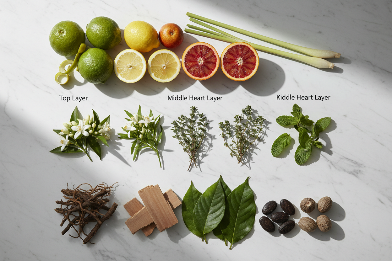 Top: Bergamot, Amalfi Lemon, Blood Orange, Lemongrass | Heart: Neroli, Tarragon, Thyme, Mint | Base: Vetiver, Sandalwood, Patchouli, Coumarin, Nutmeg