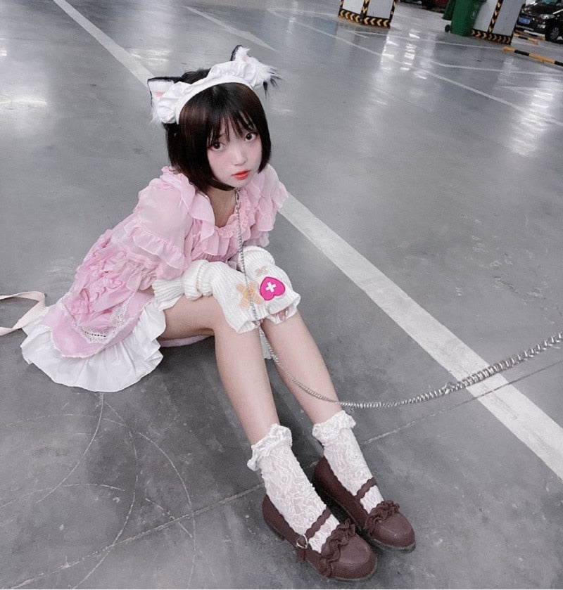 Looking for a cute accessory to complete your Harajuku lolita outfit?! Live your best Harajuku life with our kawaii heart band-aid knitted leg warmers! These one-size leg warmers have a cute heart and band-aid pattern, and are bound to become your new go-to outerwear! What will you wear these under? Get your kawaii heart band-aid knitted leg warmers today!