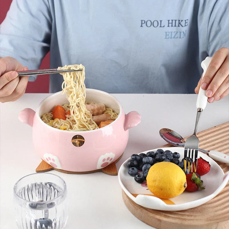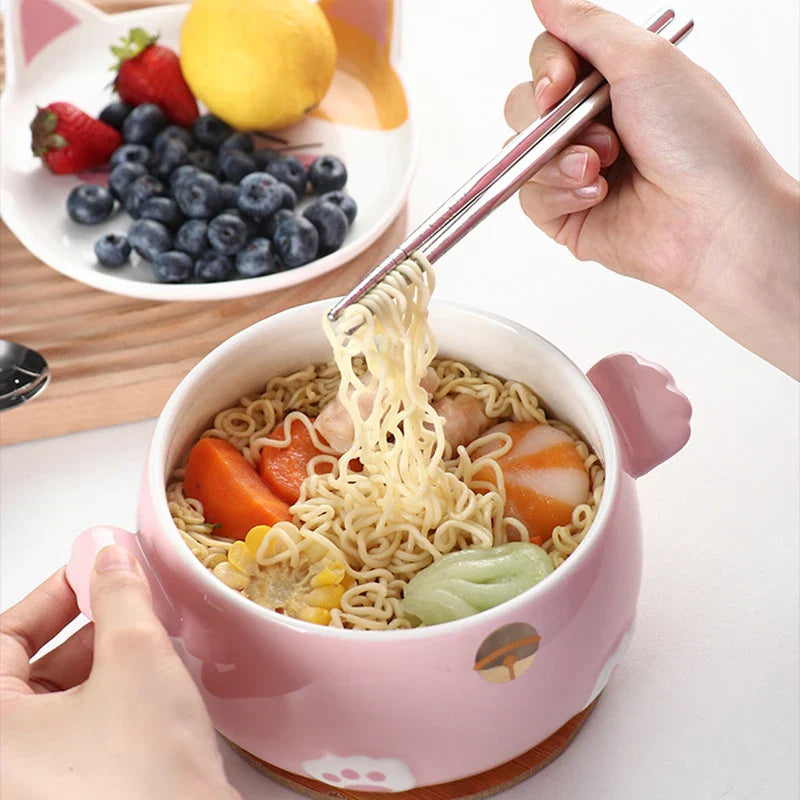 Introducing the purr-fect addition to your kitchen: the Kawaii Cat Ramen Bowl! With a lid to keep your noodles warm and three kawaii colors to choose from, this bowl will have you feline fine while enjoying your ramen. Meow that's what I call a bowl of noodles!