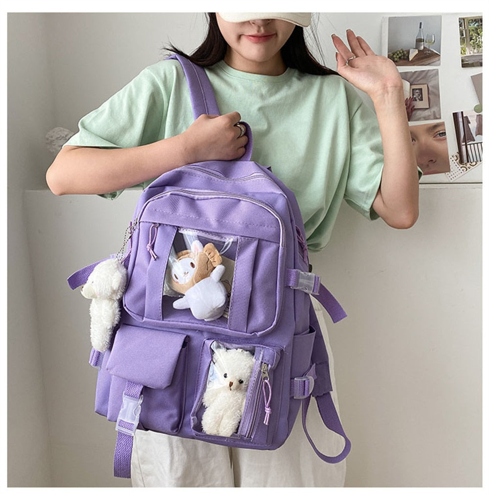 Cute Plushie Display: The standout feature of this kawaii backpack is the two window pockets on the front that showcase two plushies.