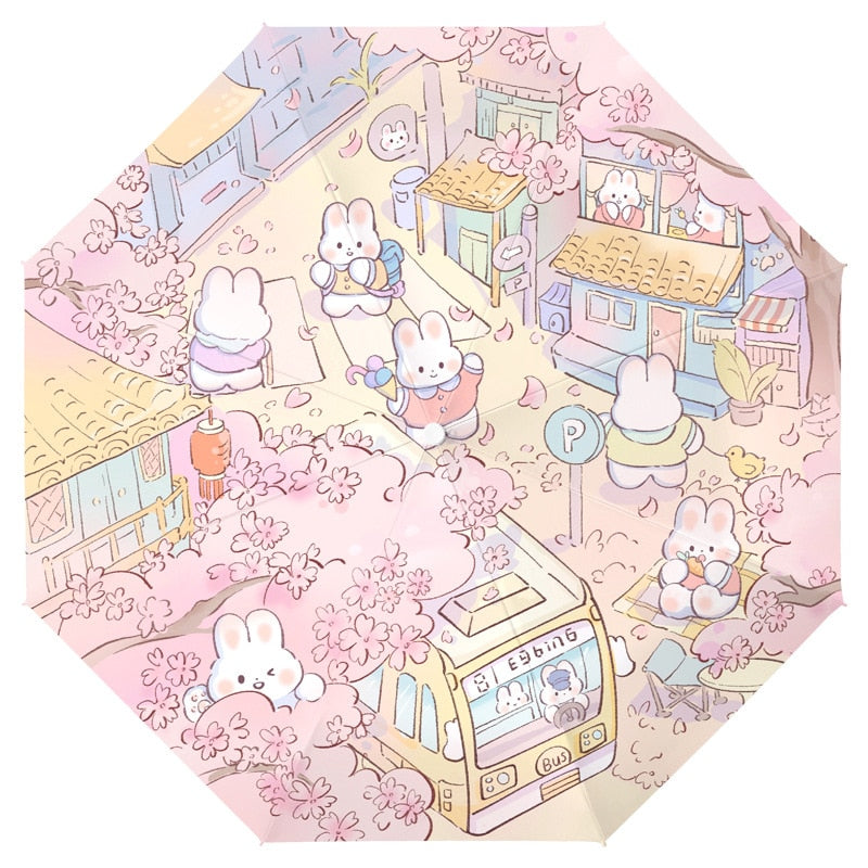 Cherry Blossom Theme: Embrace the beauty of cherry blossoms with the Sakura Town Bunny Umbrella. The canopy is adorned with delicate cherry blossom patterns, creating a harmonious blend of cuteness and elegance.