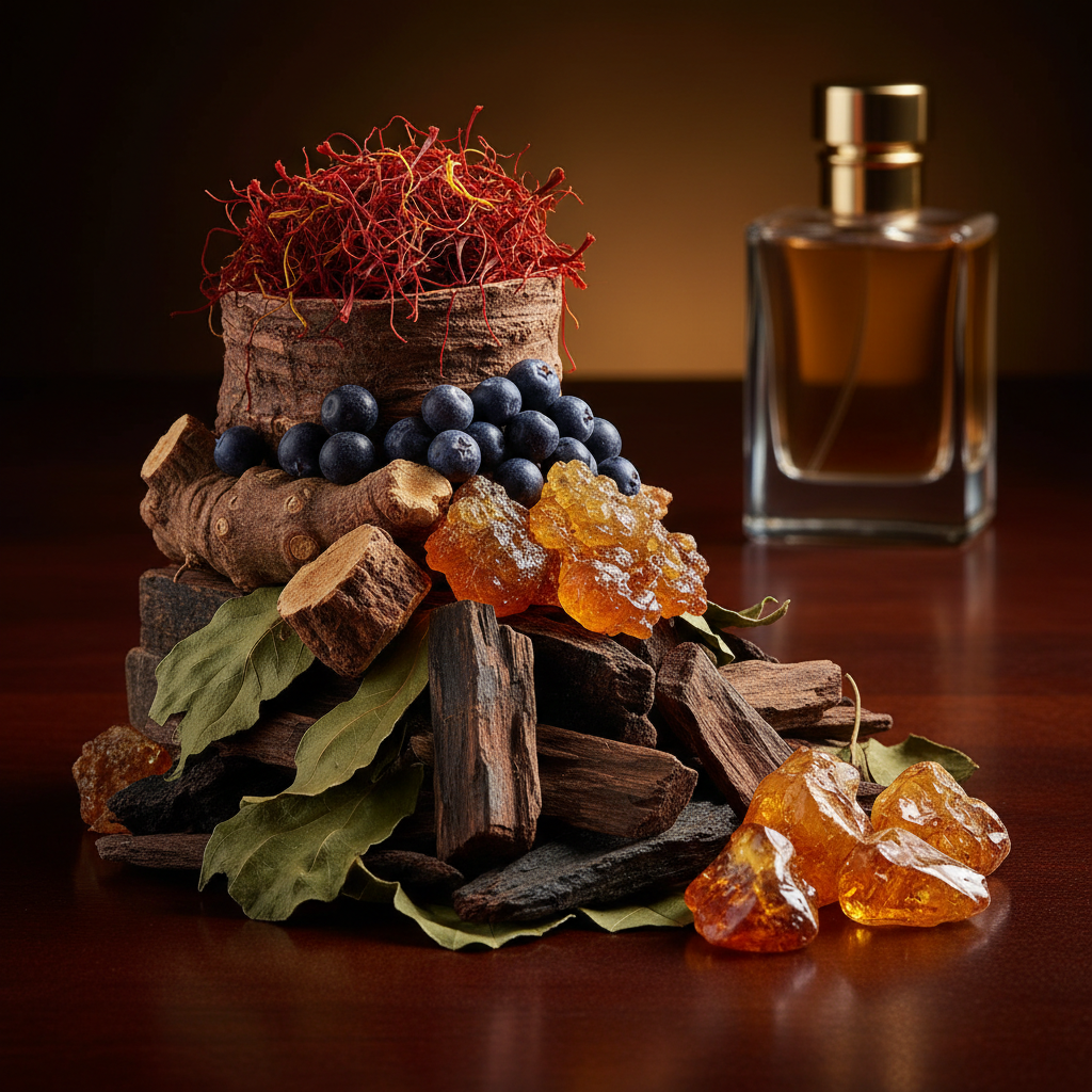 Top: Spanish & Iranian Saffron | Heart: Nagarmotha, Juniper Berries, Gurjun Balsam | Base: Laotian & Thai Oud, Indonesian Patchouli, Amber